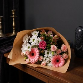 Standard - Total Stems 13. Rose x1, Spray Rose x3, Chrysanthemums x2, Alstroemeria x2, Germini x2, Euc Cinerea x2, Pistache x1