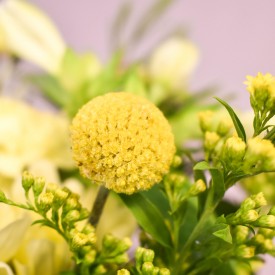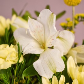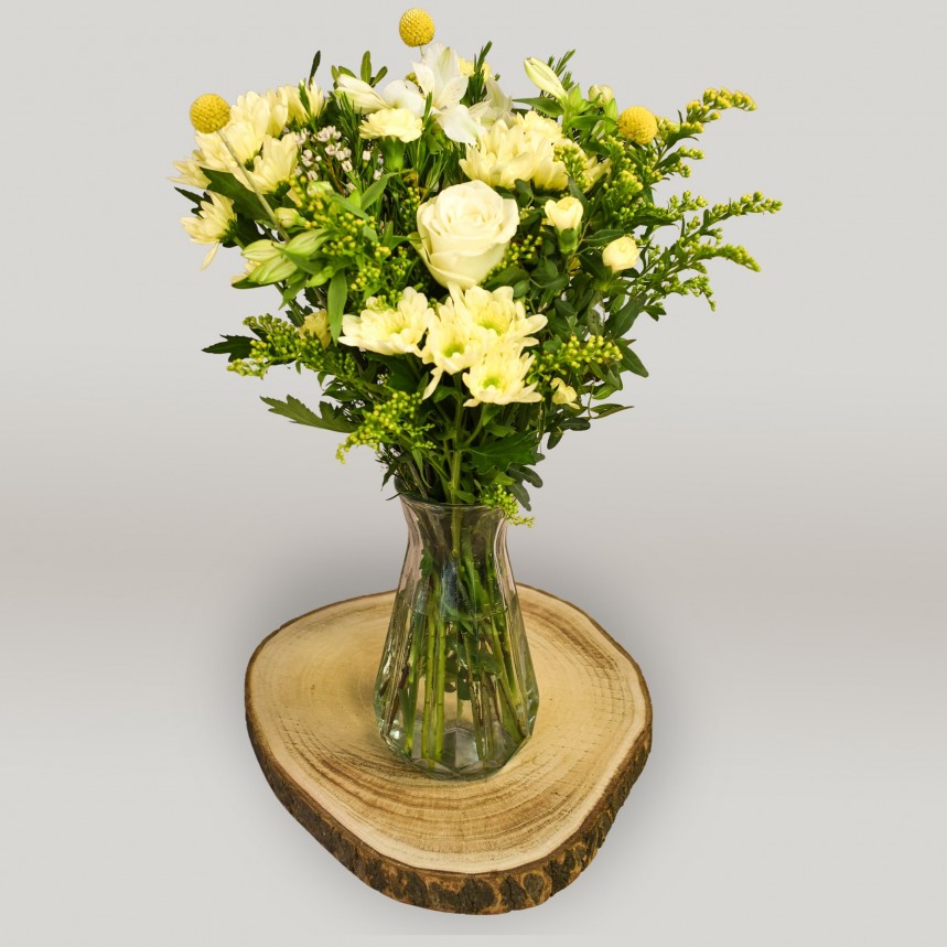 Fresh, radiant and full of uplifting charm, this bouquet is thoughtfully curated to fit neatly through a letterbox, ready to be arranged at home by the lucky recipient. A playful pop of sunshine with a mix of yellow spray carnations, yellow rose, yellow chrysanthemums, white alstroemeria with sprigs of solidago and butter yellow craspedia creates a soft, sunlit bouquet inspired by golden countryside mornings. Perfect for birthdays, anniversaries, congratulations and just because moments which should be celebrated. Vase not included.