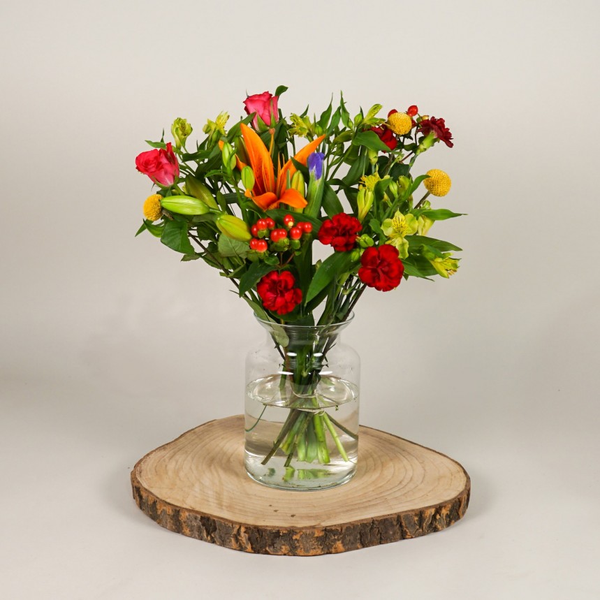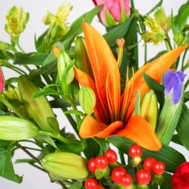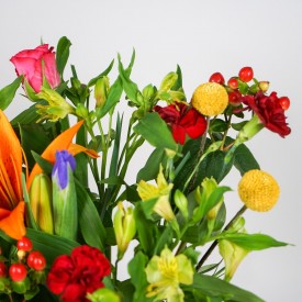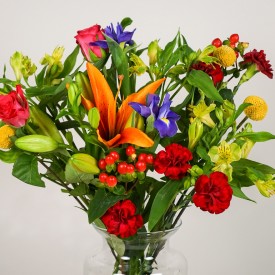 Standard - total stems 15. Lily x1, Rose x2, Alstroemeria x3, Craspedia x3, Hypericum x2, Spray Carnation x2, Iris x2