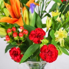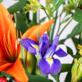 Vibrant, bold and dazzling, this joyful bouquet is thoughtfully curated to fit neatly through a letterbox, ready to be arranged at home by the lucky recipient. A striking mix of blue iris, cerise roses, burgundy spray carnations, yellow alstroemeria, orange lily, red hypericum berries and yellow craspedia creates the perfect pick me up for any occasion. Ideal for birthdays, anniversaries, get well soon, congratulations and just because moments which should be celebrated. Vase not included.