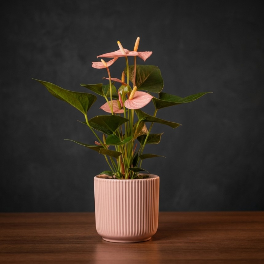 This elegant pink anthurium houseplant featuring glossy green leaves and delicate pink blooms adds a touch of beauty to any living space. The soft pink tones brings warmth and charm creating a calm atmosphere. A stylish indoor plant ideal for thoughtful gifts and any occasion.